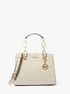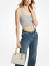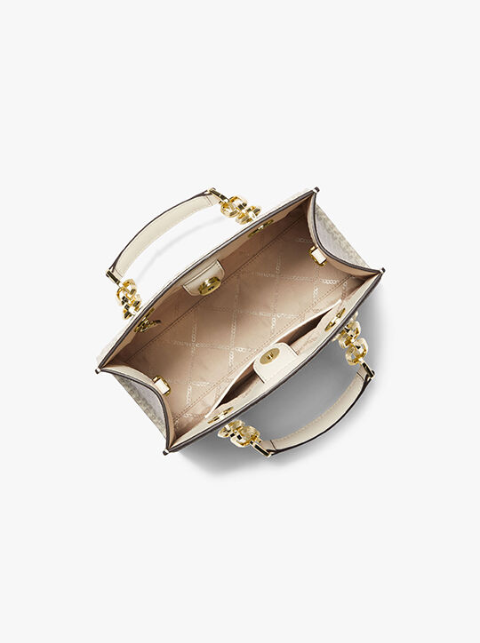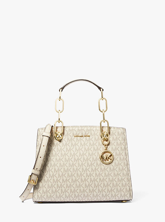حقيبة سينثيا القماشية المطبوعة بشعارنا المميز تجمع بين الأناقة والعملية. تضيف المقابض العلوية المزينة بسلسلة ولمسات من الأدوات المصقولة سحرًا أنثويًا، بينما تحافظ المساحة الداخلية الصغيرة المقسمة على ضرورياتك آمنة ومنظمة. ارتديها على شكل كتف في الأيام التي تتطلب موقفًا أكثر بساطة.