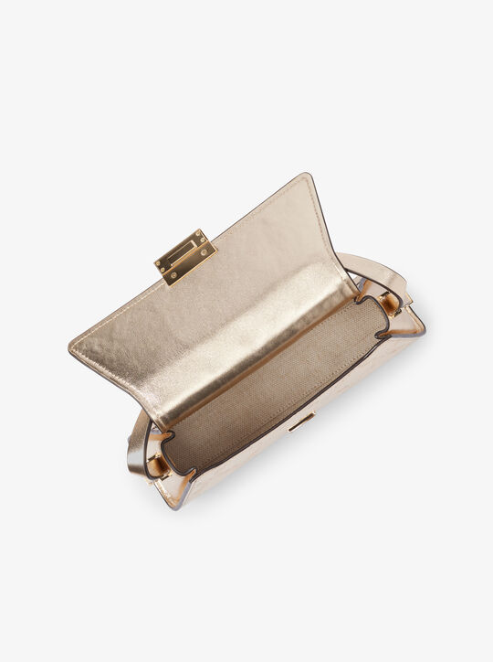 • حقيبة كتف • جلد معدني • جلد 100% • قطع معدنية ذهبية اللون • عرض 11.75 بوصة × ارتفاع 5.5 بوصة × عمق 3 بوصات • البطانة: 55% بوليستر/45% كتان • تفاصيل داخلية: جيب خلفي • قفل بزر كبس • لا تتضمن كيس حماية • مستوردة