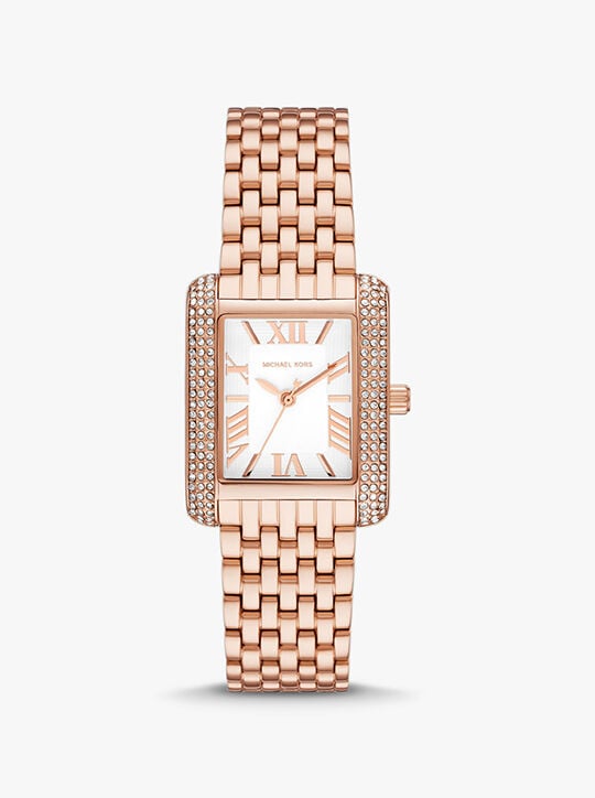 تتميز ساعة مايكل كورس إيمري مقاس 33 ملم بقرص بلون أبيض وحركة ثلاثية العقارب وسوار من الفولاذ المقاوم للصدأ بلون ذهبي وردي.