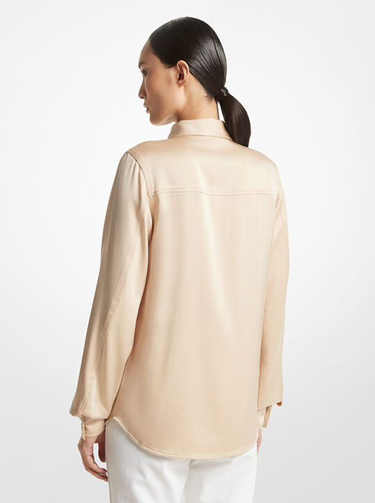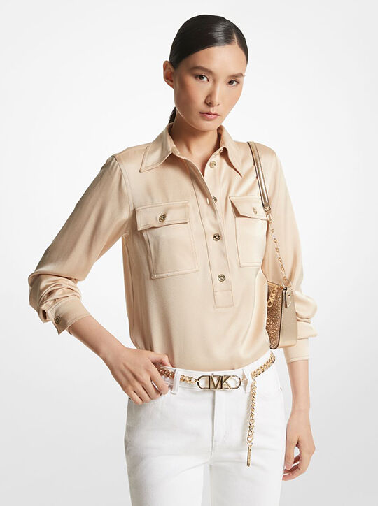 مع صورة ظلية مستوحاة من المرافق ولمسة نهائية من الساتان ، يعد هذا القميص لمسة أنيقة على ملابس العمل الكلاسيكية. يتميز بفتحة أزرار طويلة مع جيوب بغطاء قلاب، ويتميز بشكل مريح يمكن ارتداؤه بسهولة في الجينز والتنانير. ارتديها مع قطع منفصلة متناغمة.