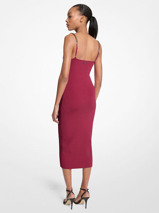Chain-link straps up the edge factor of this otherwise classic midi dress. Let the sleek, body-skimming silhouette shine by pairing it with minimal accessories—heeled sandals and a statement clutch are all you need.