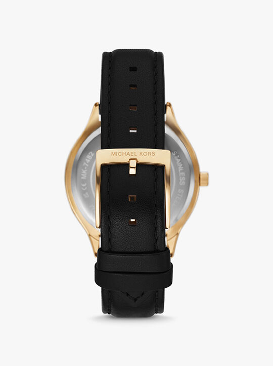 ساعة Slim Runway المرغوبة لدينا تم إعادة تصميمها بحزام جلدي متعدد الاستخدامات لإضفاء مظهر عصري. تم تصميمها بقرص أسود أنيق، وتتميز بقطع معدنية ذهبية اللون لإضفاء لمسة ذهبية على إطلالاتك المفضلة. ارتديها مع مجموعة من المجوهرات المكمّلة في الأيام التي لا تكونين فيها في العمل، أو ارتديها كقطعة مميزة عندما تتوجهين إلى المكتب.