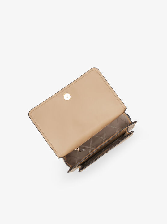 • Shoulder bag • Pebbled leather • 100% leather • Gold-tone hardware • 9.25”W X 5.5”H X 3”D • Exterior details: back slip pocket • Interior details: back zip pocket, front slip pocket • Lining: 100% polyester • Snap fastening • Dust bag not included • Imported