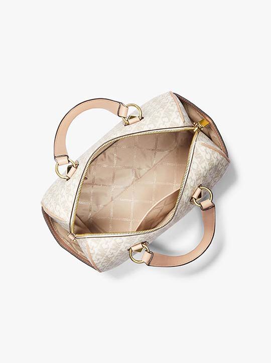 Our Grayson duffel is a glamorous finishing touch to any outfit. Covered in our Empire Signature Logo print, it’s topped with our charm and pyramid-stud accents for added shine. Top handles and an adjustable shoulder strap mean there are multiple ways to wear it.