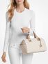 • Satchel • Logo-print canvas • 90.3% coated canvas/9.7% polyester • Trim: 60% polyurethane/20% cotton/20% polyester • Gold-tone hardware • 11.25"W X 8.25"H X 6.5"D • Handle drop: 4.75" • Adjustable strap: 19-22.5" • Interior details: back zip pocket, front slip pocket • Lining: 100% polyester • Zip fastening • Imported