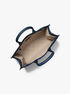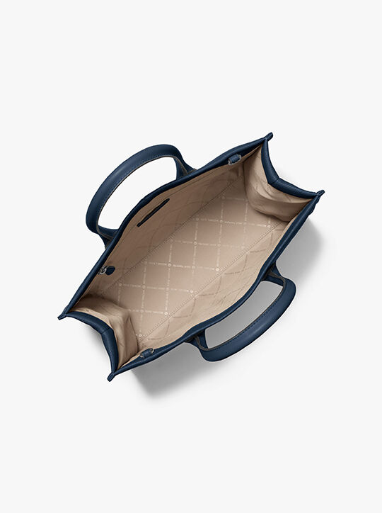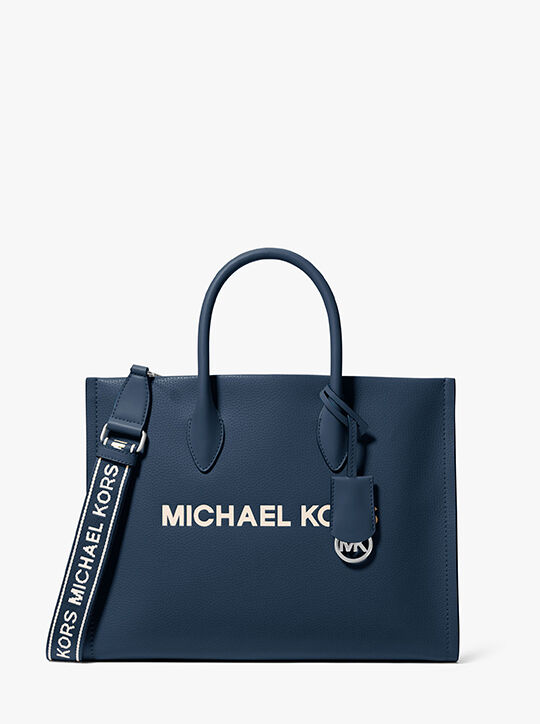 Crafted from pebbled leather in a structured silhouette, the Mirella tote features our iconic brand lettering and a polished logo charm for an ultra-luxe finish. With sleek top-handles and a woven crossbody strap, this bag will be your new daytime go-to. Wear it with denim and a classic white shirt.