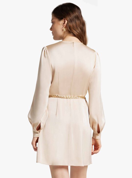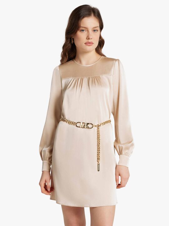 Designed with a mod sensibility, this mini dress is a cool take on the classic LBD. It’s made from lustrous satin with gathered pleating at the bust, and features slightly puffed shoulders and billowing sleeves for a hint of edge. A detachable chain-link belt etched with our Empire logo hardware completes the look.